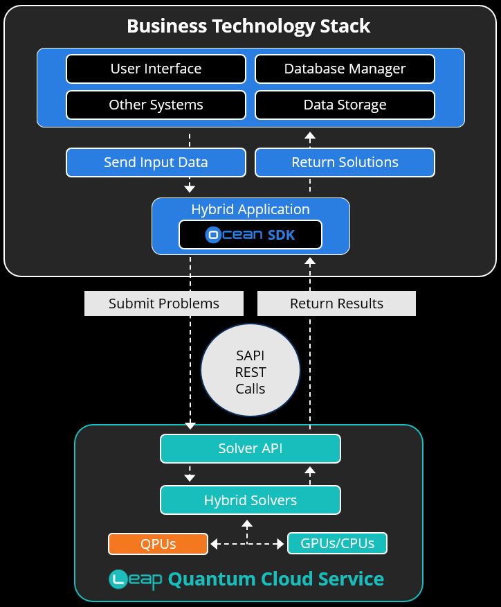 Fig. 25 Hybrid application integrated with an example of a business’s technology stack. A hybrid application receives input data from various systems in the business’s technology stack and uses D-Wave’s Ocean SDK to submit problems via SAPI REST calls to the hybrid solvers in D-Wave’s Leap service. The hybrid solvers return problem results and, again using the Ocean SDK, the hybrid application receives such results; the hybrid application postprocesses the results and returns solutions to the appropriate business systems.#